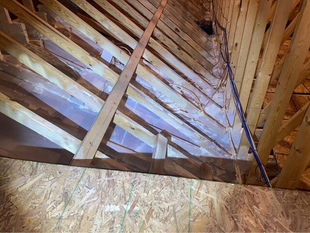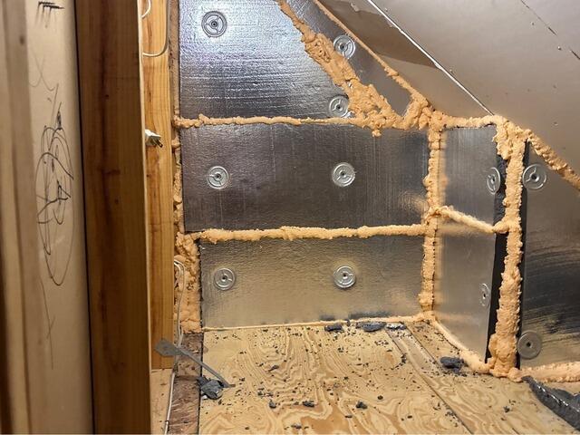 Installed TiteShell recessed light fixture cover over top of can light and sealed with ZypFoam polyurethane foam around edge and any holes made for electrical wires. Installed SilverGlo on wall and between floor joists as needed. Wrapped skylights in 2" SilverGlo to air seal and insulate. Insulated the vertical wall between the upper knee wall attic and the study attic. Insulated the Adjacent Wall With SilverGlo. Air sealed and insulated Scuttle Cover. Sealed all accessible penetrations (pipe runs, wire runs, top plates (interior and exterior)with expanding polyurethane foam. Installed TruSoft cellulose on attic floor.