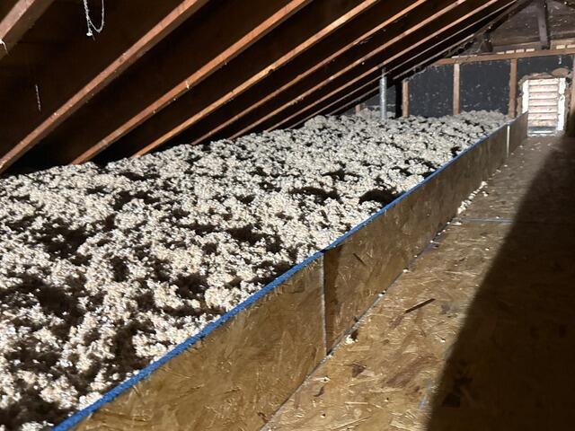 Our insulation team went out and disposed of any old , loose insulation and prepared attic for fresh clean insulation. They air sealed the area between two ceiling levels in the attic, installed Silverglo foamboard on vertical walls between levels and sealed all gaps with expanding air sealing foam. Air sealed and insulated scuttle cover. Installed super knee wall. Air sealed and insulated roof and super knee wall. Applied Trusoft cellulose to attic floor.